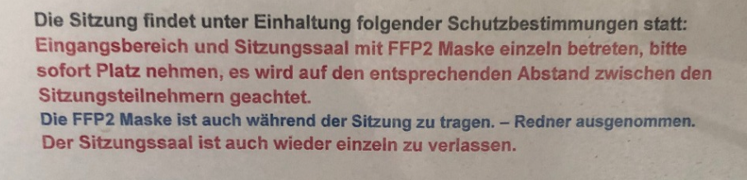 Mit ordnungsgemäß getragener FFP2 Maske und vorgeschriebenen Abstand zu anderen wurde ich bei der Eingangstür zum Sitzungssaal vom Gemeinderat Schmidt Andreas angehalten und zu meiner Verwunderung aufgefordert einen 3G-Nachweis vorzulegen. Mein Hinweis, dass es sich hier um einen unaufschiebbaren Behördengang handelt und mir ohne den von ihm geforderten 3G-Nachweis der Zutritt nicht verwehrt werden darf,